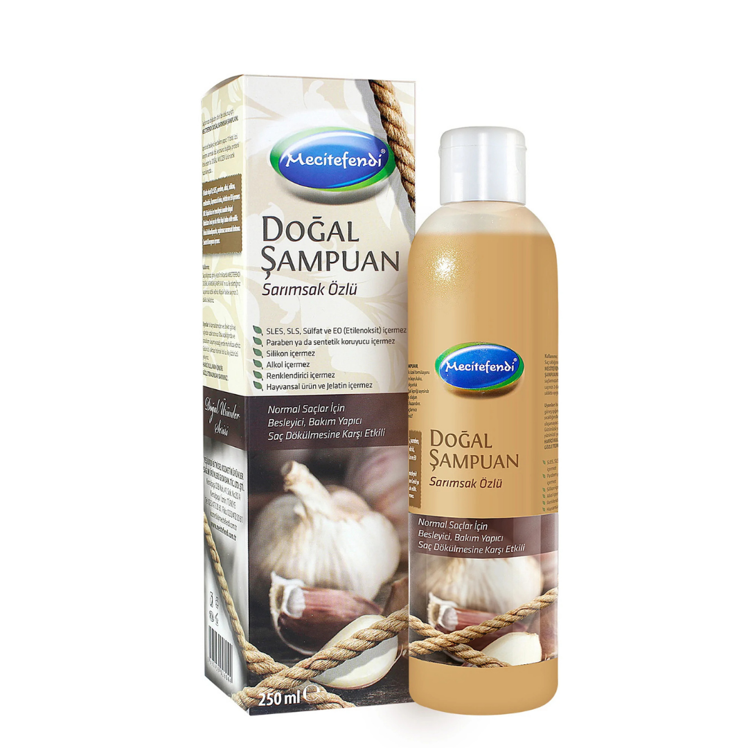 %100 Doğal Sarımsaklı Şampuan Seti, Mecitefendi'den tamamen doğal Sarımsaklı şampuan (250ml)  ve tamamen doğal Argan Yağlı Saç Bakım Maskesi içerir. Sarımsak özlü bu bakım ve besleyici şampuan, 11 farklı doğal bitki özü, buğday proteini, hindistancevizi yağı ve hurma yağı ile zenginleştirilmiştir.